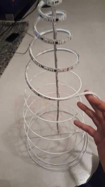 Este impresionante árbol de Navidad se enciende automáticamente cuando la luz ambiente se baja debajo de un valor definido. Se basa en una placa Arduino Mini Pro y una tira de LED RGB. Utiliza un sensor de BH1750FVY para la medición de la luz. Un pul