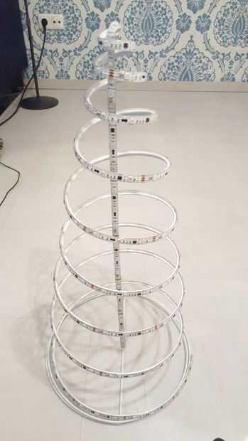 Este impresionante árbol de Navidad se enciende automáticamente cuando la luz ambiente se baja debajo de un valor definido. Se basa en una placa Arduino Mini Pro y una tira de LED RGB. Utiliza un sensor de BH1750FVY para la medición de la luz. Un pul