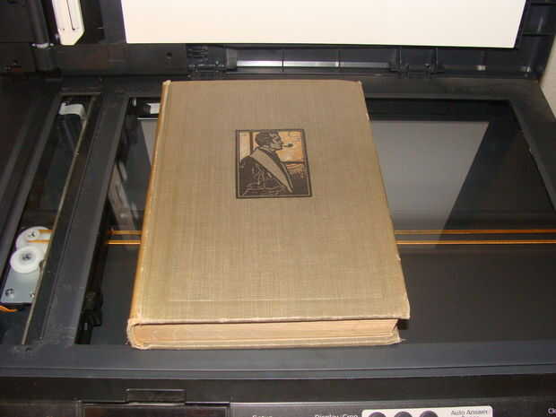 Poner el libro abierto en la parte superior del explorador con las páginas para el vidrio. Asegúrese de que está mintiendo en la dirección correcta. Si el libro es demasiado grande, se puede girar hacia los lados.