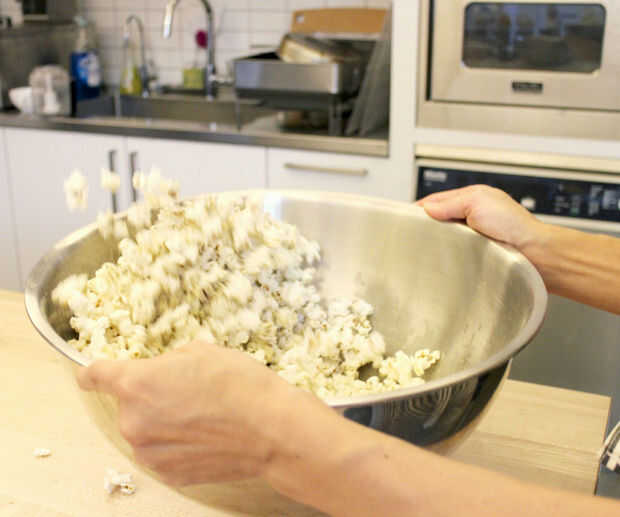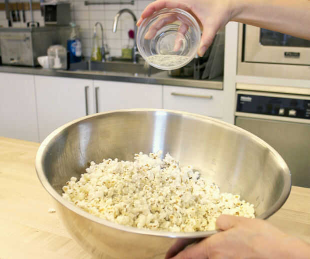 Espolvorear 1/2 de la mezcla de especias sobre las palomitas de maíz con mantequilla y tirar bien. Añadir la 1/2 segundo y sorteo/agite otra vez! (Esto asegura cobertura incluso).