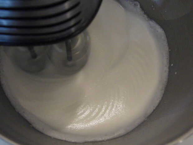 En una batidora eléctrica, con la batidora, batir claras de huevo con la sal a velocidad alta hasta que quede ligeramente espumosa. Luego poco a poco añadir el azúcar y continúe batiendo. Mezclar hasta que las claras de huevo hacer un medio pico (ver imagen).