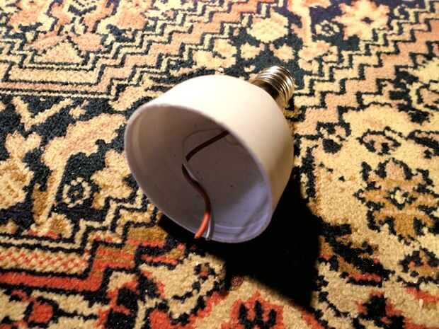 Primero decapitar el muerto bulbo - el bulbo de la eco es una buena opción debido a la carcasa de plástico después del electrodo de tornillo. A la tarea necesita un guante y un destornillador, retire con cuidado el tubo de cristal de la carcasa de plástico, tome el soldador y retirar el pcb con la electrónica. Todo lo que necesitas de la bombilla son los electrodos y la carcasa de plástico, y los dos cables dentro - una roja y una blanca. No corte de ellos, la longitud es importante!