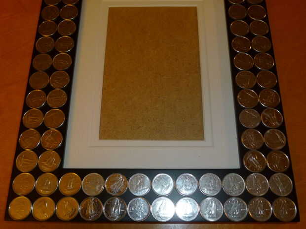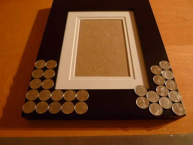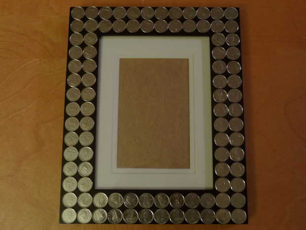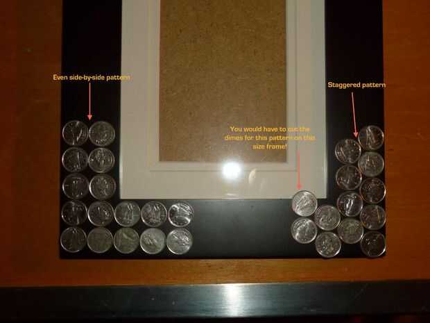 Una vez seco, comenzar a organizar algunas de sus monedas en el marco la imagen sin pegamento. Ver qué funcionará para el tamaño de marco que tiene. Usted puede conseguir lejos con el patrón escalonado o tal vez solamente el patrón incluso de lado a lado (ver fotos). En la superficie de la estructura, el área más amplia que se tiene que trabajar con - las mejores opciones tienes. Cuanto menor sea la superficie del cuadro, más difícil es para la colocación de dimes a trabajar juntos. Puede tomar un poco de tiempo para averiguar una configuración que funcione.
