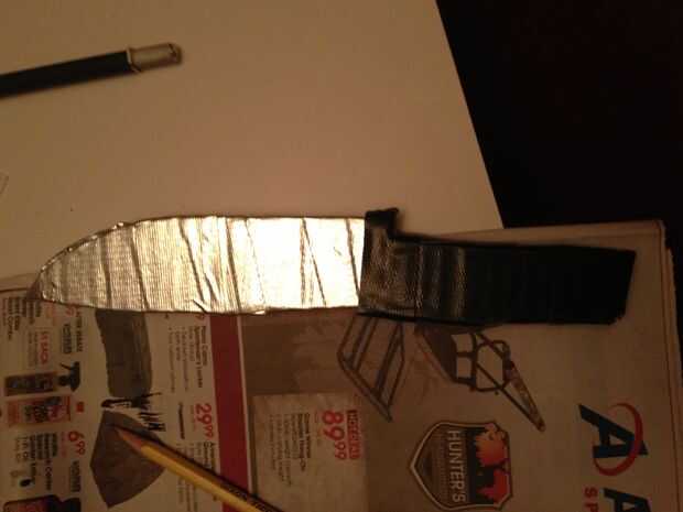 Primero encontrar alguna cartulina y dibujar la forma de su cuchillo (el slasher usa un cuchillo de cocina) luego cortar 2 de que forma esa capa al lado de uno. Luego cortar la forma de la manija (2 de cada uno). Capa de estos al conjunto y mantener junto con cinta scotch. luego envolver el mango con cinta aislante negra y la lámina con cinta de plata.