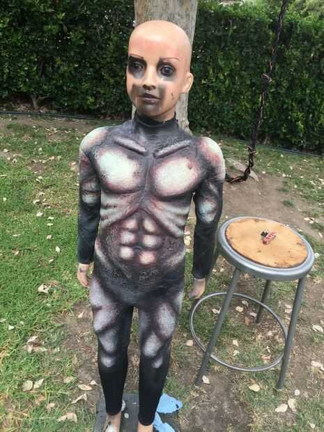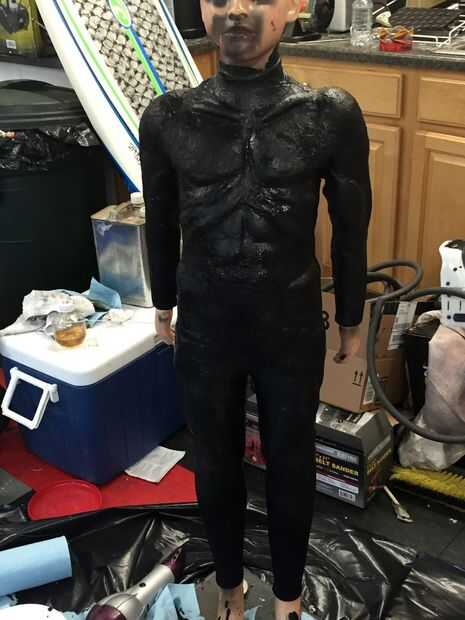 Lo primero que hice fue comprar a un maniquí barato que era de mi hijo fuera de ebay. Fue hecha de plástico, perfecto para el trabajo a mano. A continuación, comenzamos con un traje de surfista que nos "habían esculpido" musculatura en líquido látex, nylon almohadilla bateo y papel toallas. Formamos a las formas básicas del bateo y diped en el látex. Luego fue colocado en el traje como se desee. Yo con plumas los bordes húmedos para mezclar. Seguimos con piezas con bordes andrajosos toalla de papel para la piel - cantos rectos tienden a mostrar para que rasgaron las toallas en formas irregulares. Entonces hemos cepillado látex para saturar el papel. El resultado es una piel externa de goma muy fuerte en las formas que presenta. Entonces estaba listo para la pintura. Compró un aerógrafo barato de puerto de carga y algunas plantillas y me fui a la ciudad. Yo probablemente debería haber recibido un aerógrafo mejor, pero las plantillas hacen más fácil conseguir el look que íbamos para.