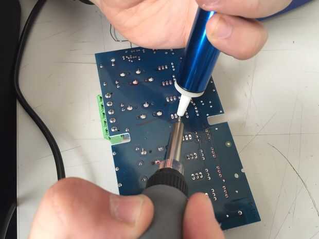 Primer paso es la soldadura de los triacs, usé una ventosa simple soldadura y soldador, aunque de mecha de soldadura es también una opción. Una vez tuve ellos me hicieron una prueba rápida de ellos una vez más para confirmar eran la causa del problema, también verificar el canal con el triac quitado y confirmado que ya no era un corto muerto.
