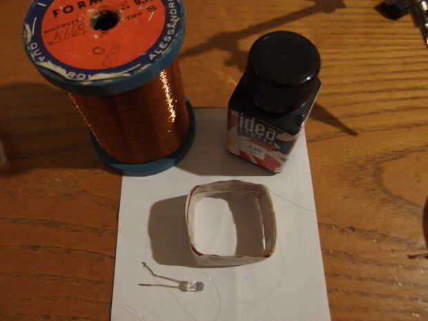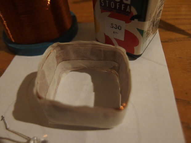 Tomé un recipiente de tinta en forma de cuadrado pequeño y aliento en él una vuelta de cinta de papel con la parte pegajosa fuera; entonces comenzó a enrollar el alambre de cobre de 0,1 mm aislado en él.