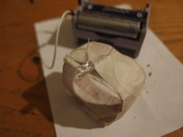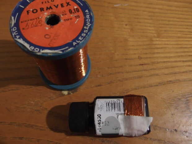 Después de más o menos 700 vueltas cubrió el cobre expuesto con otras vueltas de cinta de papel y se deslizó fuera de la botella de tinta.
