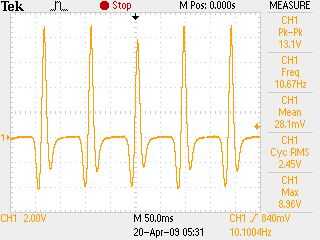 Observe que el circuito no es simétrico debido a la forma de onda de tensión generada de la bobina que la energía se concentró en los valores positivos. Esto es todo depende de la construcción del imán y del circuito magnético utilizado alrededor de la bobina.