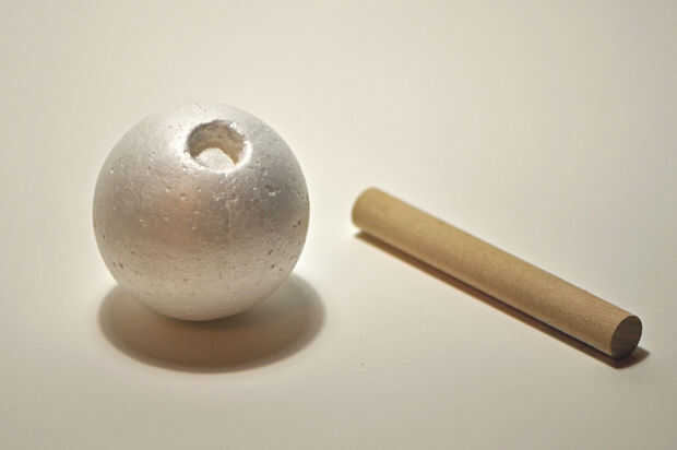 Hacer un agujero de aproximadamente 1/2" de profundidad en la bola de la espuma hacia el centro empujando el pasador en él.