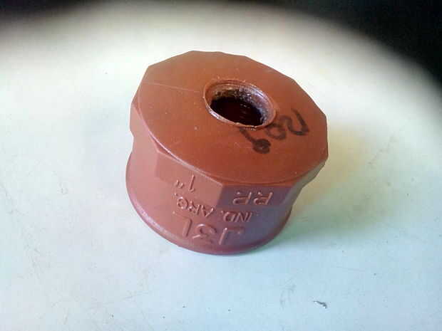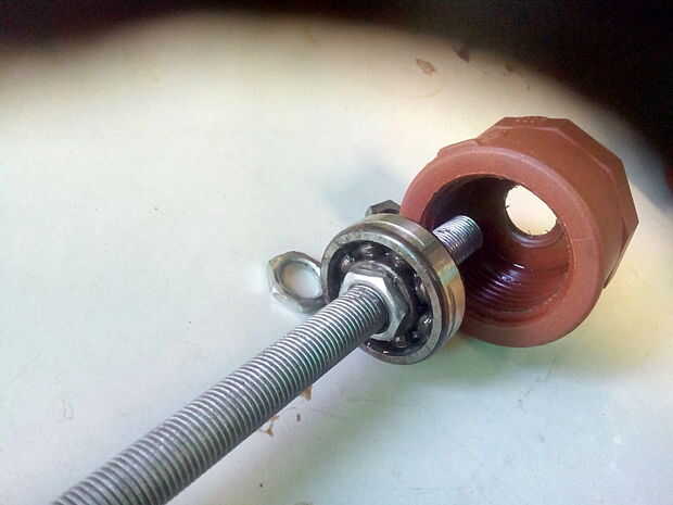 Taladre un orificio de 13 mm en la tapa lo suficiente para dejar las tuercas pasar throug, fijar la bola bering en el tubo roscado con las tuercas, dejar 5 cm de tubo a un lado, poner dentro de la tapa Luego enrosque el niple a la tapa firmemente, esta parte tendrá las piezas giratorias del dispositivo Sería útil que la tuerca en el tubo con un soldador de estaño para no dejes aflojar