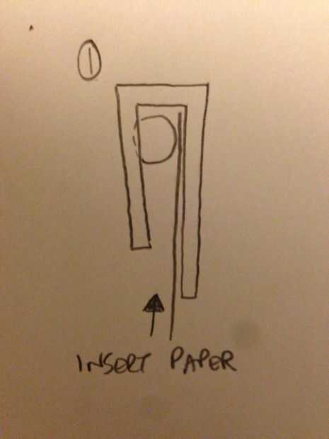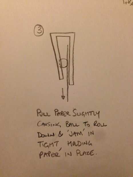 Así que para obtener el clip de agarre, es colocar el papel entre el corredor de fondo (plano) y la bola. Que la bola caiga el hueco más estrecho (entre el corredor de la parte superior e inferior). A continuación, tire ligeramente el papel hacia atrás fuera - este apriete y jam la bola entre el corredor superior e inferior, sosteniendo el papel en su lugar...