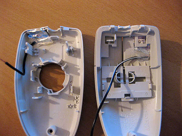 6. una vez que el pegamento esté seco puedes poner los botones del ratón detrás en la carcasa superior.Cuando te debe haber algo así como 4 abajo de la foto.