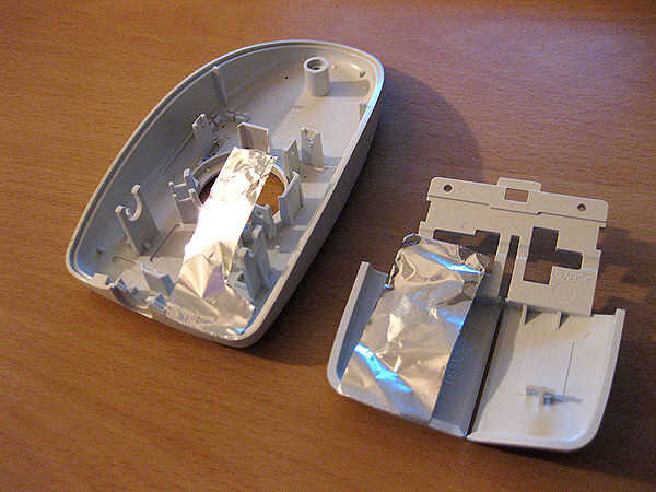 2. 2 cortar pedazos de papel de estaño que se ajustan muy bien en el interior del botón del ratón.Estos pasos que tienes que hacer suavemente y con paciencia. Usted no quiere el papel de estaño para triturar.
