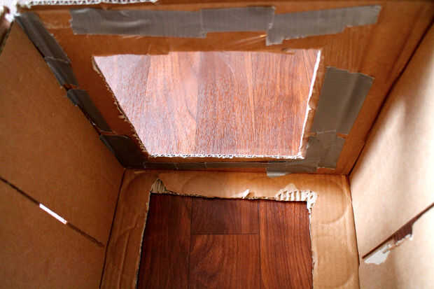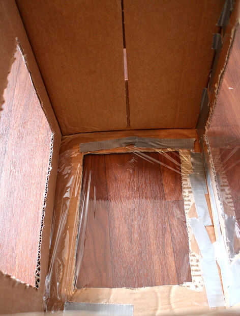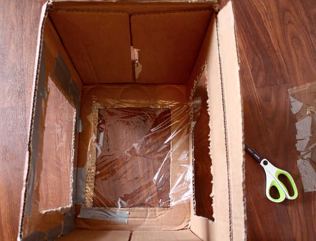 4. abrigo de saran cinta en el interior de la caja de cartón para cubrir los huecos de ventana.