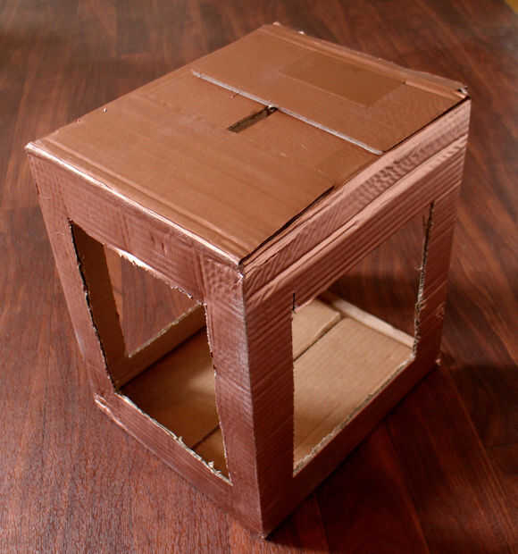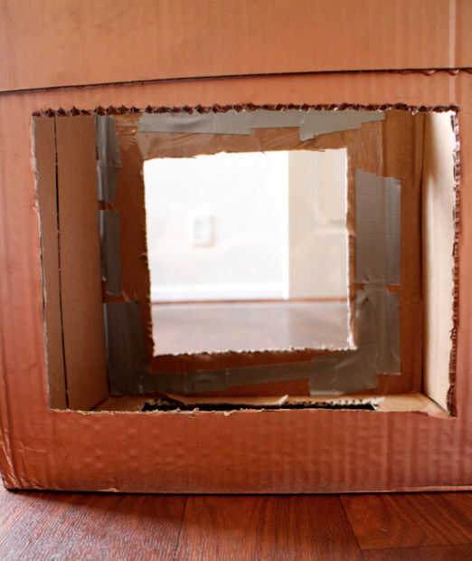 2. cortar ventanas en 3 de los lados de la caja de cartón.
