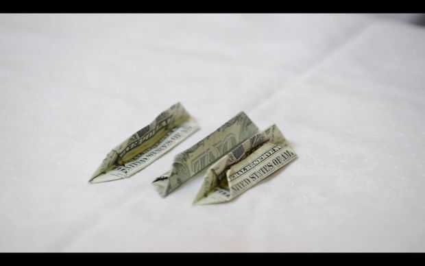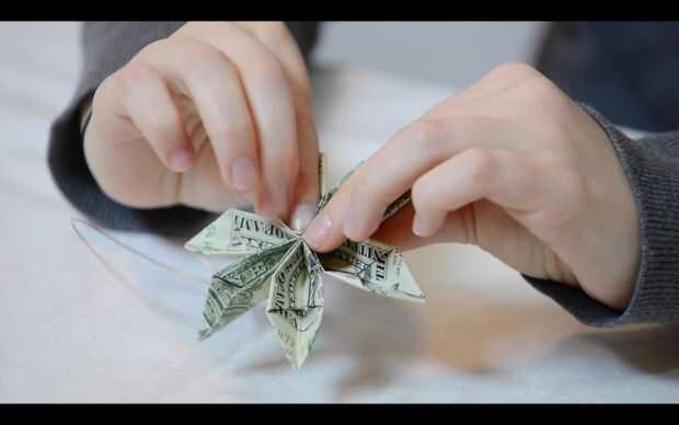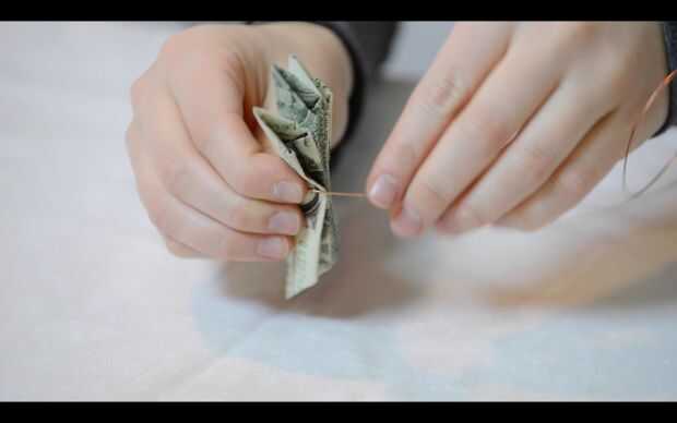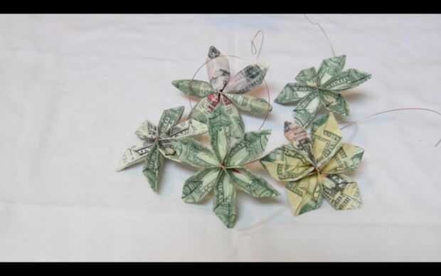 Una vez ha doblado tres proyectos de ley como se describe en los pasos 1-6, tomar los tres de ellos y enfrentarlos de igual dirección. Manteniéndolos en su centro, envolver el hilo varias veces alrededor del centro, asegurándose de dejar extra para la madre. Extender los pétalos separados con el pulgar y los pliegues para que ponen abrir. Usted necesitará algunos de estos para que su árbol no parece tacaño! A nadie le gusta un regalo barato :)
