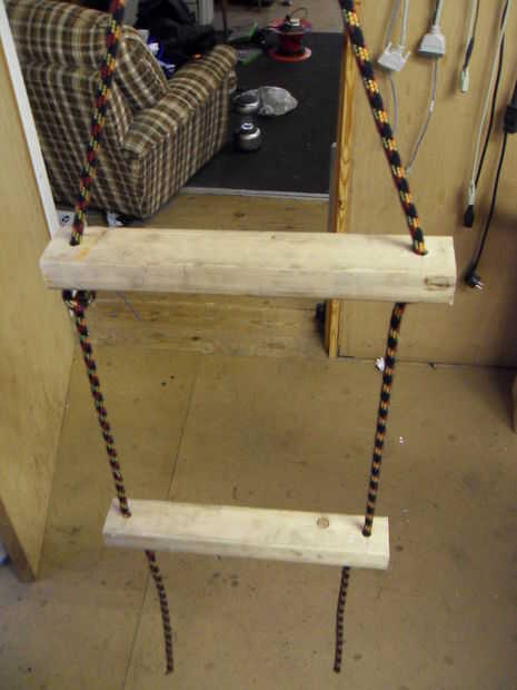 Cortar cada una de sus lamas. Mi plataforma fue 80cm de ancho así que mis peldaños terminaron siendo 40cm de ancho. Perforar ligeramente más grande que su cuerda de 3cm de cada extremo y luego ejecute algún papel de lija sobre cada escalón para evitar astillar sus manos/pies mientras lo subía.