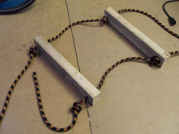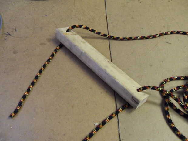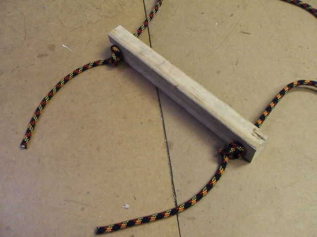 Atar otro nudo del 30-40cm más lejos a lo largo de cada cuerda y enrosque el peldaño a él como antes. Repetir este proceso hasta que estés fuera de cuerda o peldaños.