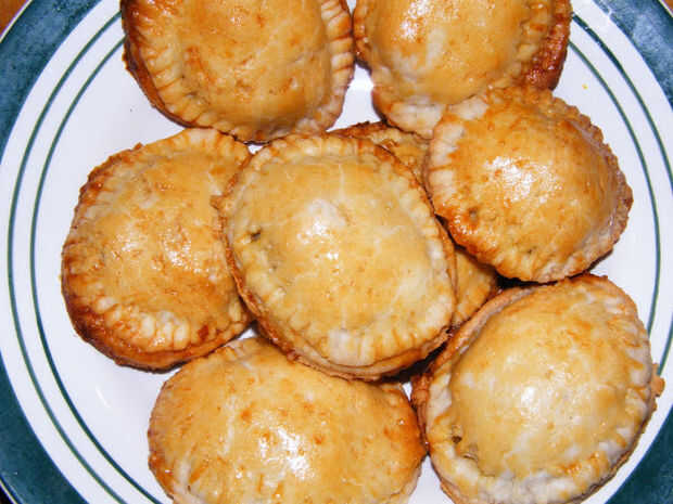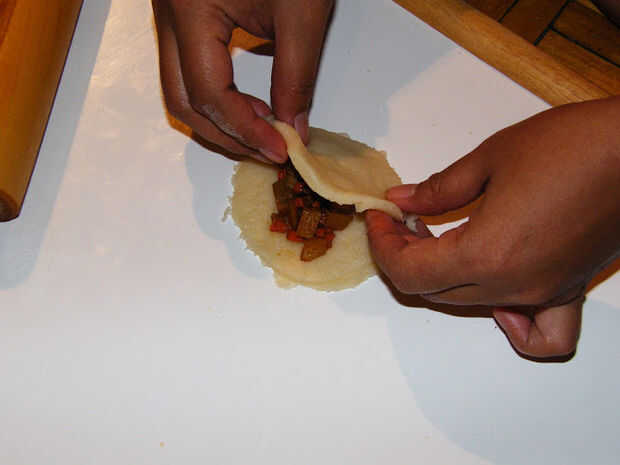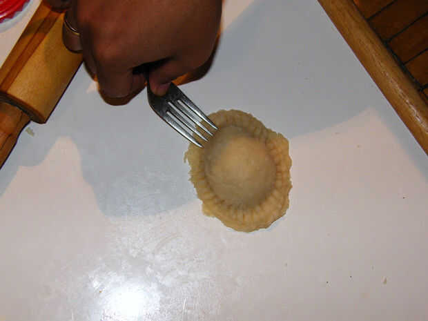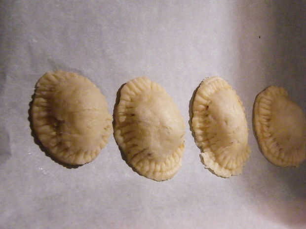 Poner bastante relleno (aproximadamente 1 cucharadita cada uno) en 12 círculo y arriba que unos círculos con otros círculos de masa. Costura para sellar y plana a los lados con un tenedor.