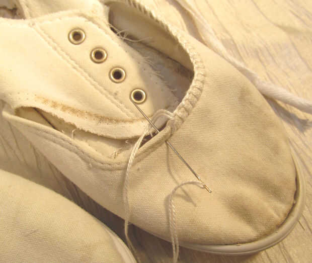 yo utiliza una longitud doble de algodón de perle y los agujeros en el zapato de la costura original e hice una puntada manta alrededor de la parte delantera de la zapatilla.  Utilice una aguja de bordado fuerte, robusto con un gran ojo.  Comienzan y terminan los hilos con unas puntadas detrás en el forro del zapato.  Tenga cuidado de que las puntadas no se muestran en el lado derecho.