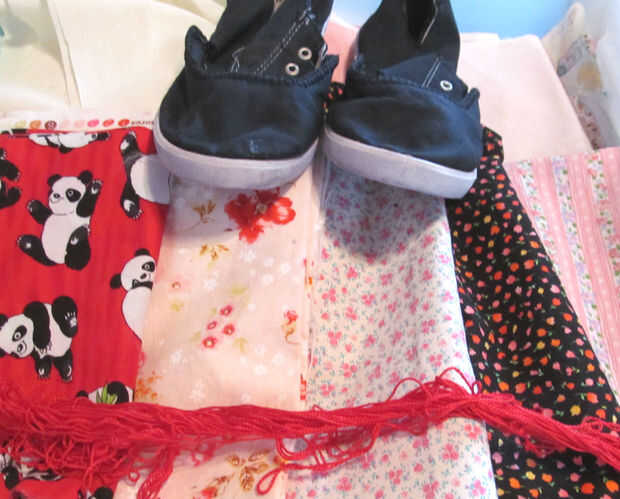 Siguiente decidí que tela utilizar para cubrir las plantillas.  Definitivamente quería algodón y quería coordinar con el hilo de algodón teñido de.  Use una tela de la marca de lápiz o bolígrafo para marcar la forma de la parte posterior del zapato.  Use la porción de corte para marcar la parte correspondiente del otro zapato.  Recuerde, los zapatos son una imagen especular uno del otro.   Corte todas las secciones de calzado no deseados.