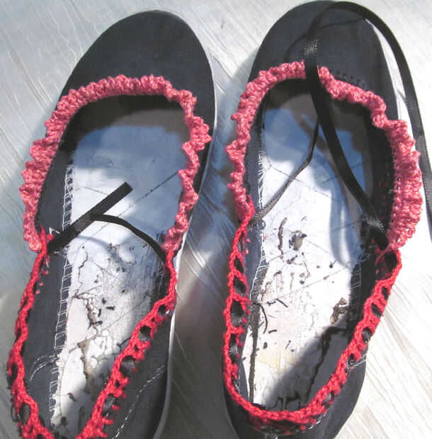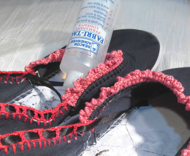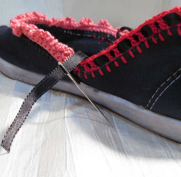 Rosca 1/4" cinta sobre una aguja y tejer adentro y hacia fuera entre los ganchillos doble alrededor de la parte posterior. Fui uno, bajo dos, por lo tanto dos ganchillos doble ver fuera del zapato. Corte los extremos de cinta larga y usan pegamento para tela que no empapará a través de la tela para pegar la cinta termina abajo en el zapato.