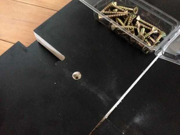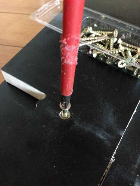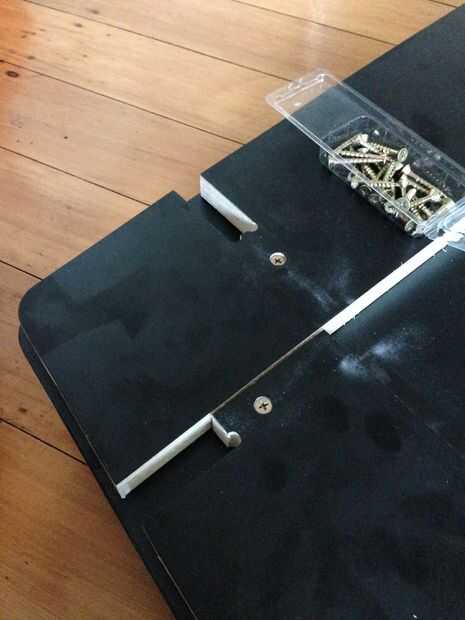 Perfore un agujero en la base de cada uno de los recortes de esquina que el tornillo se ocultará debajo de la articulación de la pierna. Tenga cuidado de no perforar a través de la parte superior! Haga un avellanado en cada uno de los orificios y ajuste los tornillos de cabeza avellanados.