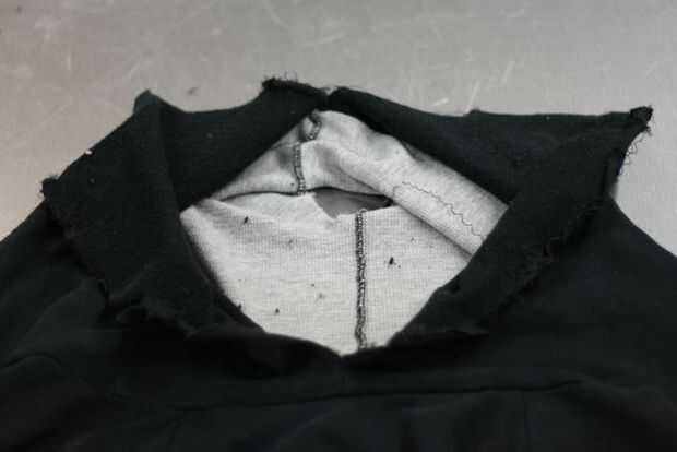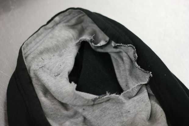 El hoodie sí mismo aquí tiene dos capas. El interior gris capa y la capa negra exterior. Arrancó la costura de la capa gris sacó la parte de atrás a través de esta abertura y arrancaron una gran cantidad de la capa posterior de esa manera.