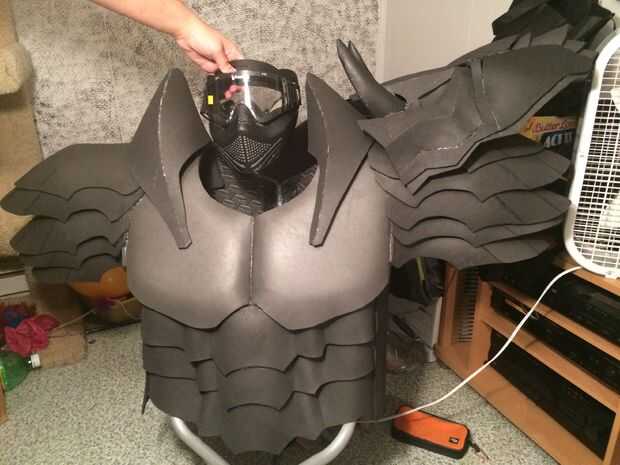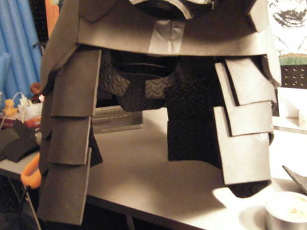 Dejo espacio entre la armadura del hombro para que mi hombro podría caber cómodamente dentro. También divide la falda de armadura inferior de la zona abdominal y pecho superior y utiliza triángulos velcro y espuma para apoyar y fijar los dos. Lo hice para que puedo sacar la falda para sentarse si quería en el bar etc, pero terminé encontrando más fácil sólo reposar toda la noche!
