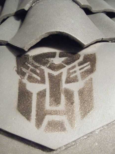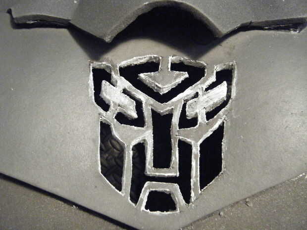 Como para el cinturón con el logo de transformador, literalmente aerosol pintado el logo de encendido y con mucho cuidado recortar con un cuchillo del exacto! Le digo tenga cuidado porque corté yo bastante mal en esta parte, así que verlo! Luego coloqué una carpeta naranja detrás para darle un marco agradable para la iluminación.