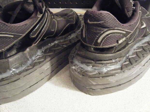 Los pies fueron hechos fuera de viejos Nikes que tenía de trabajar en Disney! Así que supongo que es tipo como pongo a un poco Disney magia en mi traje de todo el tiempo que pasó en esos zapatos en los parques! :) Literalmente caliente pegué mis zapatos en 3 pedazos de espuma gruesa para hacerme bastante unas pocas pulgadas más alto! Luego construir piezas de espuma fina alrededor de mi zapato para que se vea como un zapato gigante de metal! Hacen mis pies mucho más grandes, que es otra molestia al caminar así que ten cuidado!