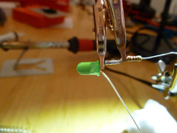 Tuerza el alambre de un lado de la resistencia (no importa cual) y el cable de LED desde el lado de "Cátodo" del LED (el lado con la marca plana y la pata corta).