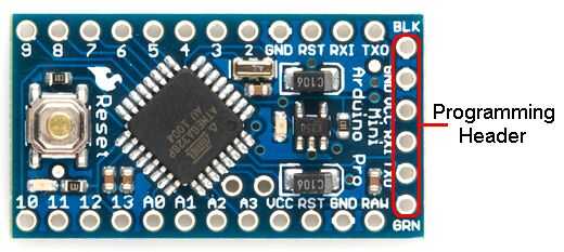TIP: en lugar de soldar un encabezado a la cabecera de la programación, utilizar "Encabezados sin soldadura", como la parte de SPARKFUN PRT-10527. ESTAS cabeceras permiten programar tu ARDUINO PRO MINI y son removible y reutilizable cuando se realiza la programación.
