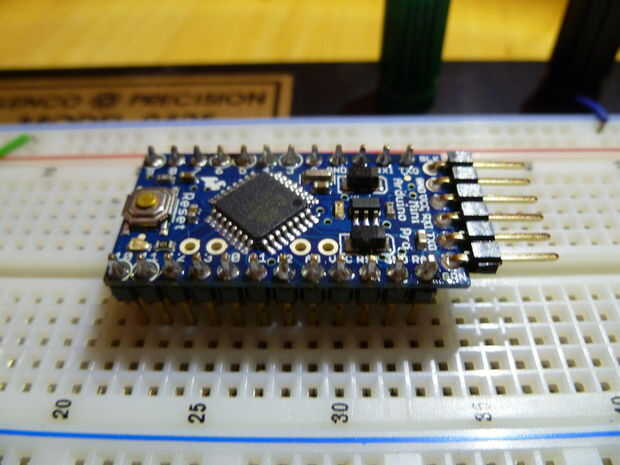 El Arduino Mini Pro viene sin cualquier encabezado por lo que tendrá que añadir algunos usted mismo. En primer lugar las secciones separadas dos 12 polos y pines macho. Éstos se sueldan en los lados como se muestra. Usé mi protoboard para mantener los pernos alineados durante la soldadura. Para la cabecera programación puede ya sea soldadura de seis pins macho de ángulo recto, o seguir la punta abajo y utilizar encabezados sin soldadura para la programación.