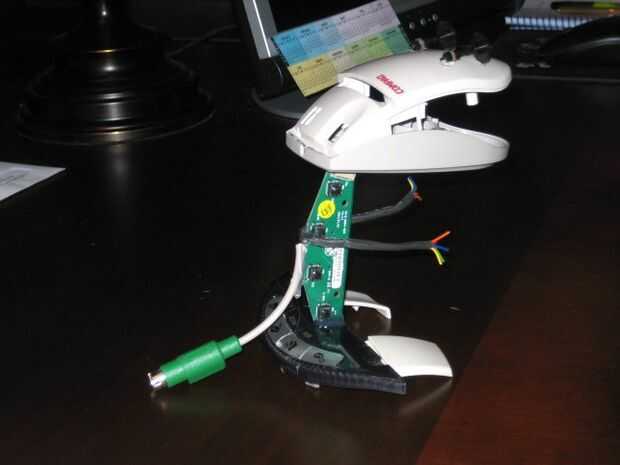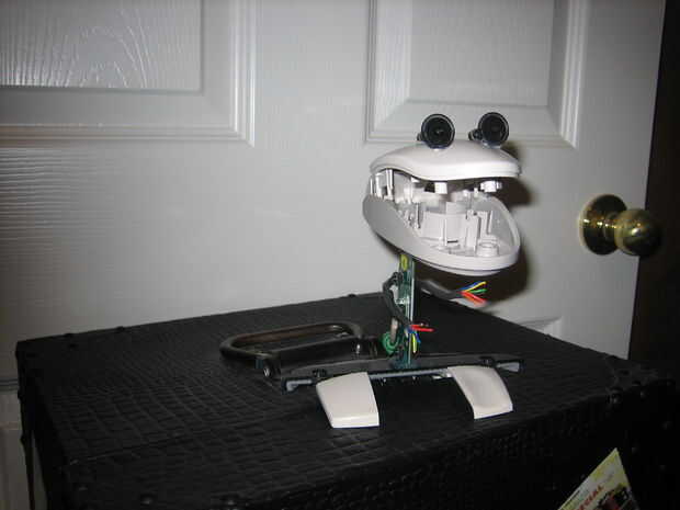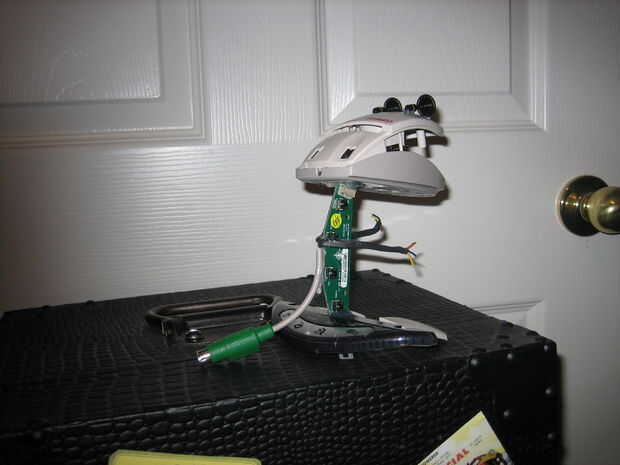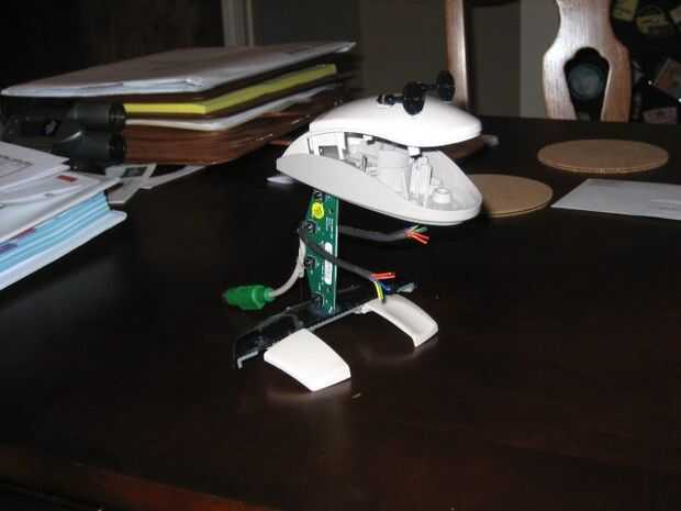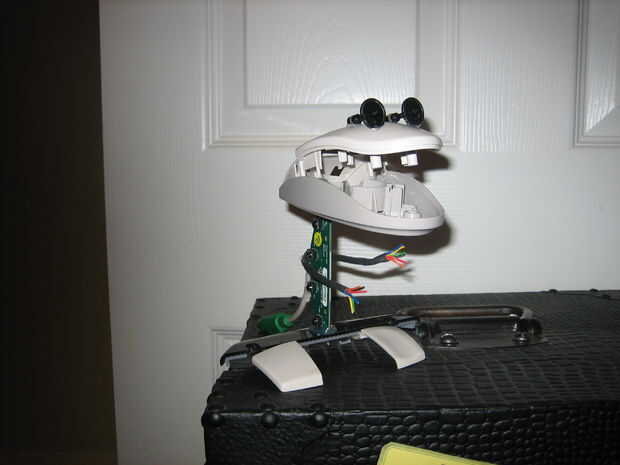 Ninguna parte de este ratón se perdió... La cáscara fue utilizada para la cabeza, los botones izquierdos y derecho se convirtió en los pies, los sensores de pista se convirtieron en los ojos y el cable fue utilizado para los brazos y la cola. La bola rodó debajo de mi mesa de trabajo y es al parecer perdida para siempre. La base y el cuerpo vinieron de un viejo escáner de interruptor.