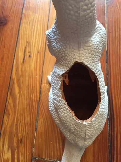 2. Perforar 2-3 pequeños agujeros en la parte inferior (en el vientre) de los dinosaurios - esto permitirá que la maceta drene para que el suelo no recibe mohoso después de que agua.