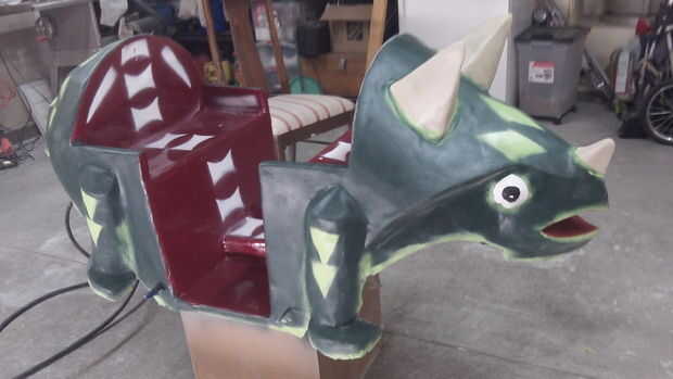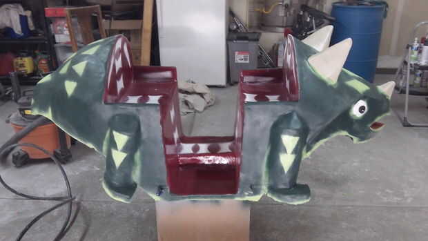 He comprado pintura en aerosol de colores que pensé sería dinosaurio mirando y se divirtieron con él. Pintado los ojos, cuernos, esperadas a secar entonces enmascaran el cuerpo pintaron, enmascararon por la zona de boca y el asiento y pintaron. Para los alumnos pusieron cinta adhesiva sobre el ojo, cortar un círculo y utilizar un pincel para el alumno. Para los detalles hizo las plantillas de cartón. En este punto usted debe estar viendo todo vienen juntos así que tome su tiempo de divertirse con él. Puesto que su casa sería en la arena y no quería que las chicas frotando la pintura en el suelo o deslizamiento que pinté algunos 3 M reflectante pisada el mismo rojo de los asientos, cortan dos piezas para encajar el piso y pegado abajo.