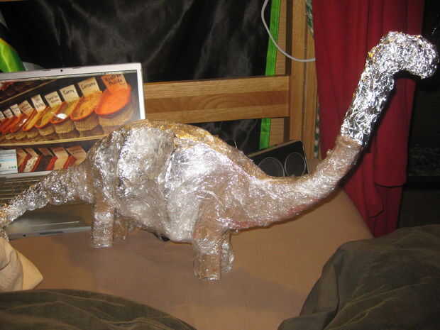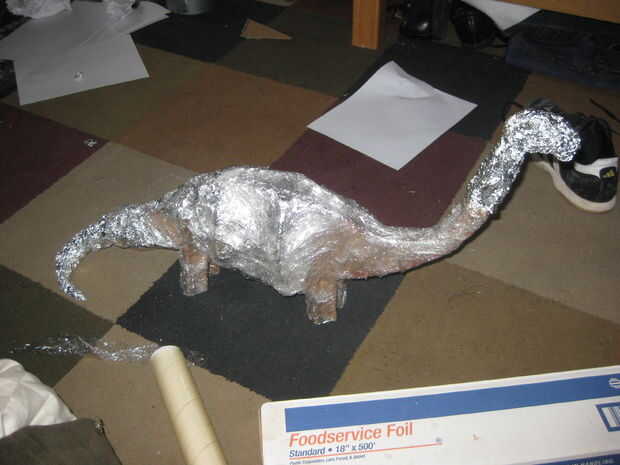 a continuación, decidí sin ninguna razón, excepto que sonaba bien, al abrigo de saran / envoltura de papel de aluminio el modelo del dinosaurio. Retrospectivamente, no era necesario pero podría haber ayudado a un poco (no tarda mucho tiempo tampoco).