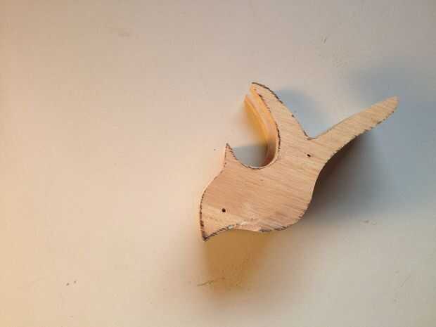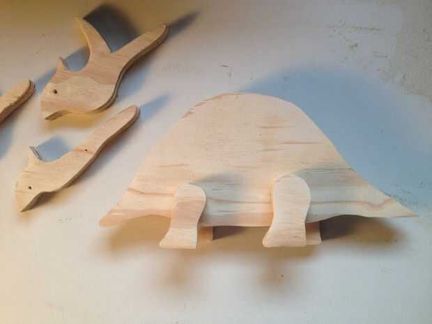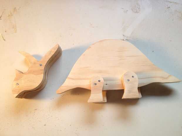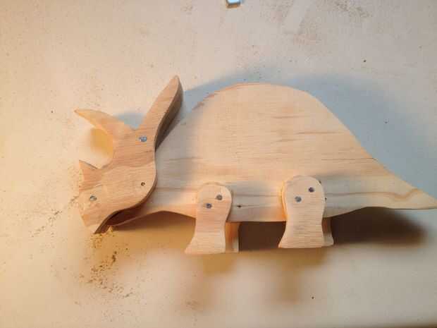 Pegar la pieza cabeza interior outers, asegurándose de que el cuerno de la nariz y volante en todas tres están alineados. Uñas las tres piezas juntas. Un clavo bien puesto lo grandes ojos para tu dino. Hice un clavo en cada lado de la cabeza en aproximadamente los mismos lugares. Puede que necesite hacer lijado adicional de la cabeza después de poner juntos para asegurarse de que las cosas son suave y uniforme.