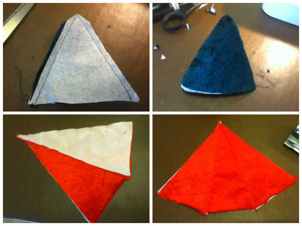 Para los triángulos de la cola que desea coser ambos lados de los triángulo medio derecho lados juntos a los otros 2 triángulos por lo que terminas con un triángulo muy amplio (ver foto arriba).