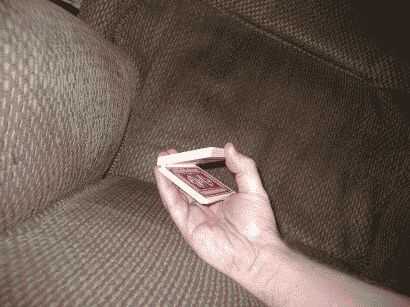 Rueda pulgar para arriba para la parte inferior de su dedo pulgar sale de las tarjetas. Esto debe dejar parte de la caída de la cubierta en la palma de su mano.