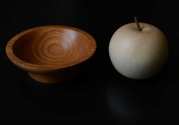 El tazón de fuente es la cereza. La manzana es arce suave con un tallo de nogal, que yo también. La mejor manera de aprender a hacer bien es tomar una clase y luego buscar para convertir videos en youtube. Los cortes para la fabricación de un recipiente son muy difíciles de entender sin que se muestra práctica.