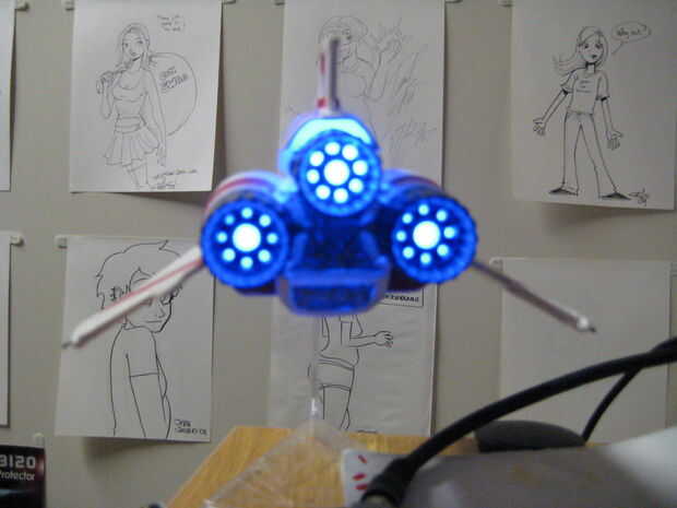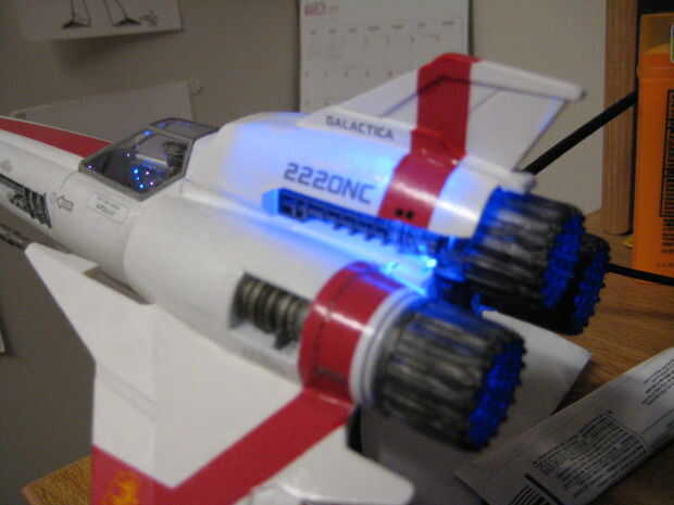 de este Instructable, construí un modelo de diodo luminoso de la Viper MK. II de la nueva serie de Battlestar Galactica. El kit es fabricado por Moebius, recomiendo el kit de Viper Mk II y su kit de Battlestar Galactica, son ambos muy divertido hacerlo. Diseño personalizado y - había construido todos los circuitos involucrados. Se dispone de kits de iluminación, pero son caros y no muy impresionante. Corrí a fibra óptica de un número de diversos colores de LED a la cabina para simular medidores y lecturas, utilicé tres LEDs de 3mm azul para cada motor, y usé un parpadeo LED rojo para las luces de punta de ala.