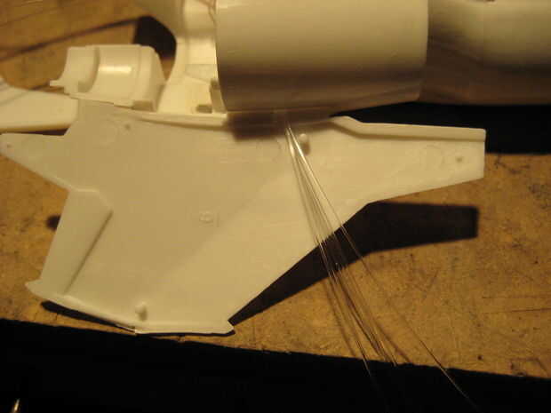 Para obtener las puntas de las alas a flash, un paquete de .5m m fibra óptica fueron atados a un rojo intermitente led. Estas fibra óptica entonces fueron pegados a lo largo del ala y caber dentro de surcos que fueron talladas en el interior de las alas para que la fibra óptica podría iluminar las puntas de las alas. Pegamento blanco fue utilizado para el encolado de fibra óptica para impedir que se dañe la fibra óptica.