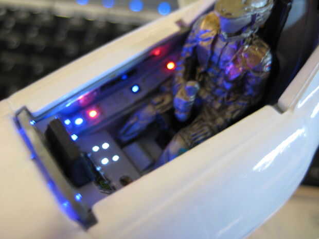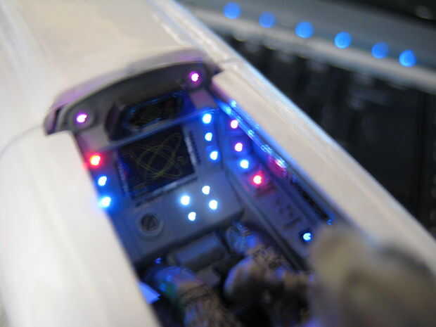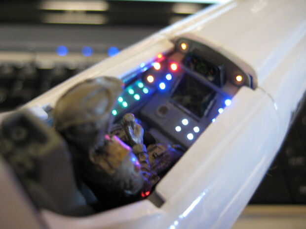 a la luz de la cabina, perforé un conjunto de agujeros con una broca de 0,5 mm en un tornillo de perno. Un paquete de 5mm fibra óptica estaban conectados a cada LED. Los otros extremos de la fibra óptica estaban pegados a los agujeros, usando pegamento blanco, ya que muchos pegamentos fibra óptica a ser frágil. Se utilizaron diversos colores de LED, junto con un LED RGB que cambia de puesto lentamente entre diversos colores, que parece genial en la cabina.