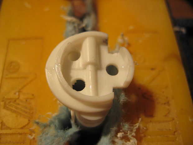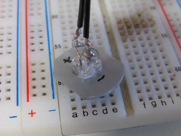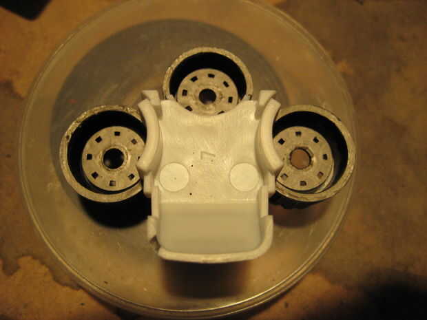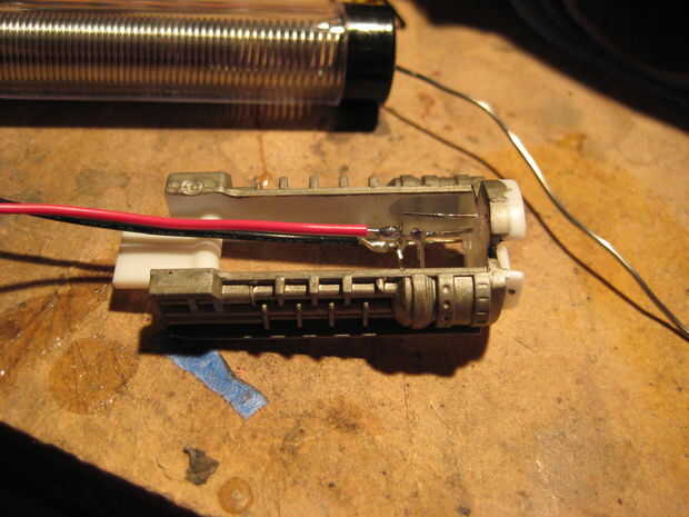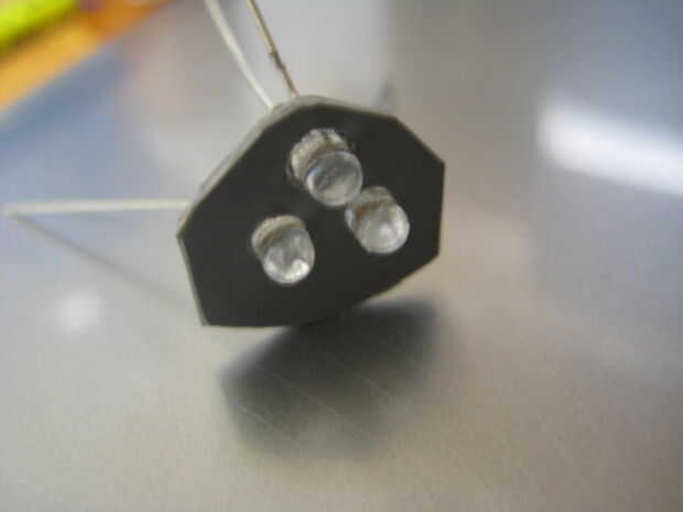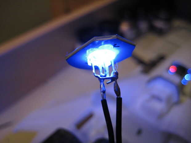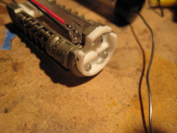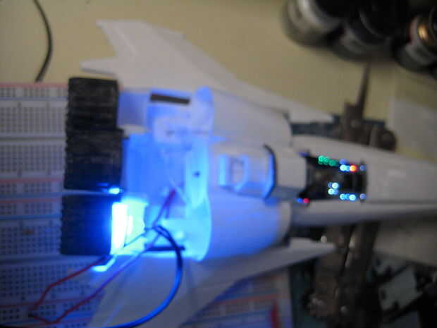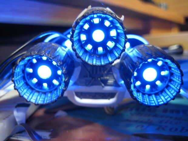 Para encender los motores de dos menores, fueron cortar dos piezas de plástico para caber dentro de los motores de tal manera que el modelo todavía podría ser montado. Cada pieza de plástico tenía tres agujeros perforados en él, y fue pegado un LED en cada agujero. Los LED fueron soldados juntos en paralelo, como se muestra abajo y conectados a la fuente de alimentación. Las piezas de plástico se pegan luego hasta el interior del motor. Los agujeros fueron perforados a través de los inyectores del motor para que pasarían más luz. Tres círculos de papel de impresión regular entonces fueron pegados en el interior de los inyectores del motor para que actúen como difusores de luz. Para encender el motor superior, se perforaron tres agujeros a través del componente de detalle de motor y tres LEDs se pegan. Una cosa que es importante tener en cuenta es que la parte posterior de los LEDs debe ser pintada de negra para prevenir fugas de luz, y el interior de las piezas del motor debe pintarse de negro para evitar fugas de luz hacia fuera. El plástico utilizado en este modelo es bastante transparente a la luz que se escapa hacia fuera desde el interior, así que si usted no toma estas precauciones, toda la parte posterior de la víbora iluminará de azul. Accidentalmente se me olvidó hacer esto con el motor superior, y así el ensamble del motor entero superior brilla intensamente azul cuando las luces estén encendidas.