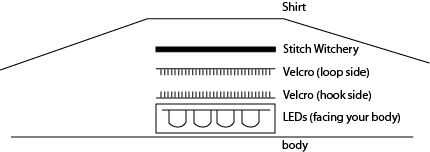 Había puesto las tiras de LED para que los LEDs mirando mi cuerpo, no la camiseta. Esto también ayuda a aumentar la distancia entre los LEDs y la tela de difusor produciendo un resplandor suave. Ver la imagen de abajo para el orden en que fija todo.