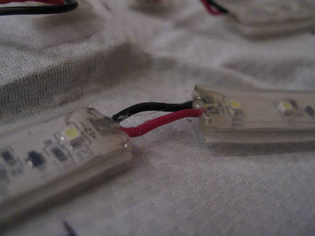 Afortunadamente, si está usando las tiras del mismo yo soy, cada extremo cortado de la tira LED está claramente marcado con un + y -. Más o menos, todo lo que necesitas hacer ahora es soldar todo el + cojines juntos y todos los - pads juntos. Hacer una pequeña planificación - que desea reducir al mínimo el número de veces que un alambre atraviesa una sección blanca (los cruces de cable generalmente se aprecia). También, para usar sólo 1 conector de batería, las tiras necesitan estar conectados en un lazo único.