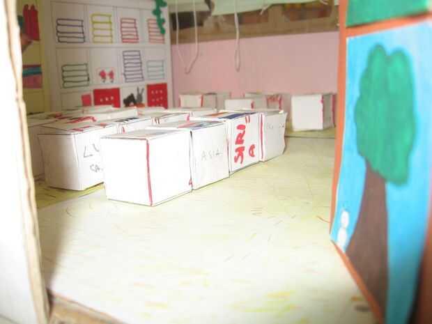 Si hay armarios o librerías en le aula, puede utilizar algunas cajas para hacerlas, sólo cubierta con el papel y dibujar tiradores, carteles, libros y todo lo que hay en ellos. He utilizado papel amarillo claro para armario y estantería realizada en madera de Fresno.